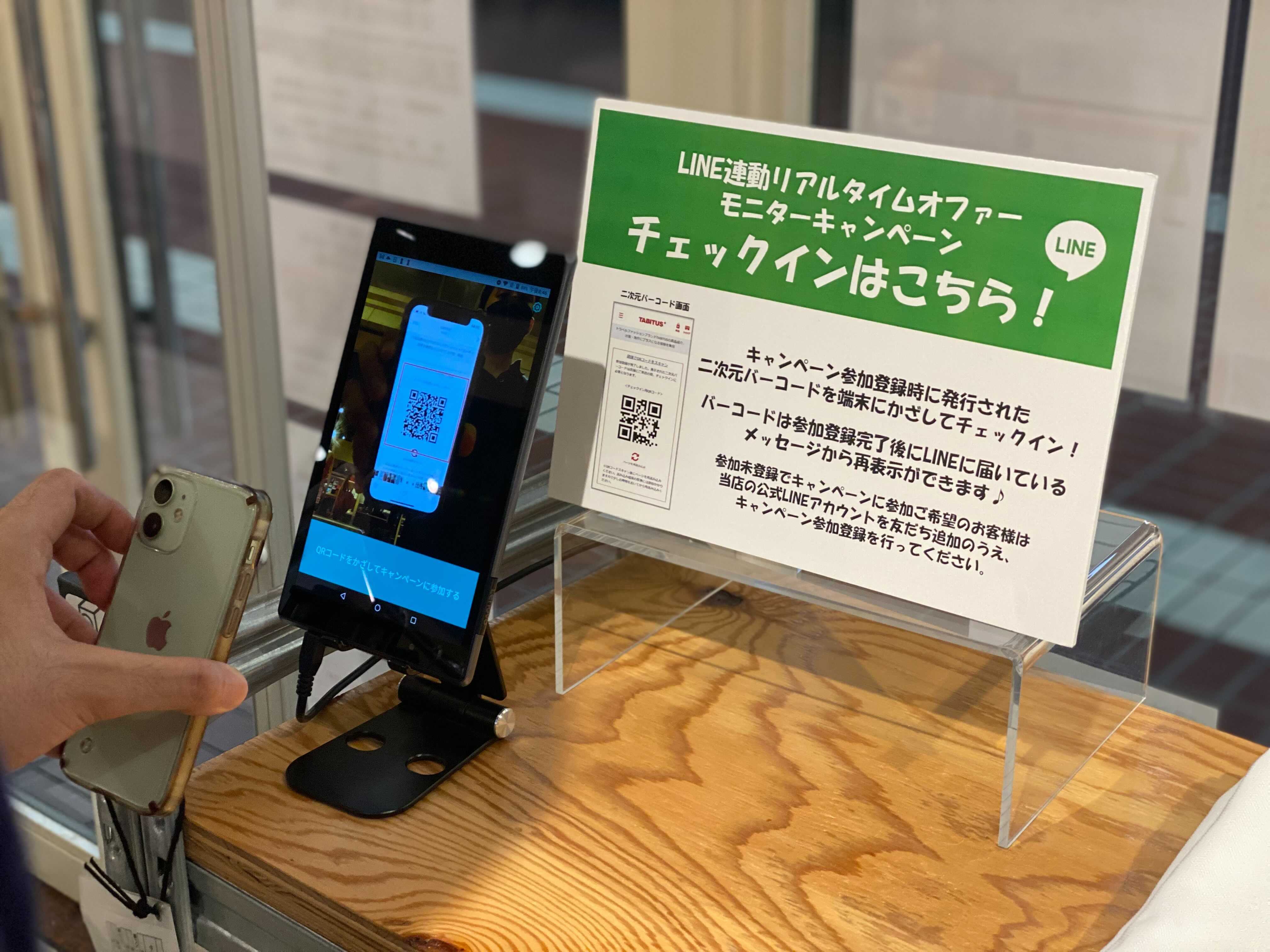 TABITUS+ STATION(タビタスステーション)のLINEより発行されたQRコードを、店舗内に設置されたチェックイン用のタブレット端末にかざすことで入退店の記録を行いました。その他、店舗内の3D距離センサー、顔認証機器を用いて、回遊状況、商品棚ごとの滞在時間など、お客さまの店内行動を計測しました。また、来店前後のWebサイトのアクセス状況と組み合わせることで、オンラインとオフラインを融合させたお客さま行動の分析を行いました。