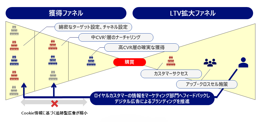 4)生活者が商品を認知してから購買に至るまでの意識や行動を漏斗(ろうと)に模して表すマーケティングの概念。ここでは、認知~購買までを顧客獲得ファネル、購買以降のLife Time Value(ライフタイムバリュー、顧客生涯価値)強化をLTV拡大ファネルとして示している。