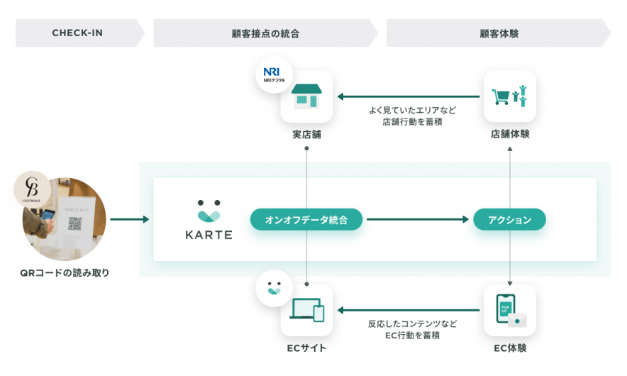 本取り組みを通じて、「CB CRESTBRIDGE」の「お客さまのすべての日常に寄り添う」というコンセプトを体現した新たな店舗体験の実現を推進していきます。NRIデジタルとプレイドは、オフラインとオンラインの様々な接点における顧客体験をシームレスにつなぐ共通基盤の開発およびその活用支援を共同して展開してきました(※3)。主に、店舗における行動データの解析はNRIデジタルが開発したSaaSインテグレーションサービス「OMO OnBoard」が、ECにおける行動データの解析とオフラインとオンラインのデータの統合はプレイドの提供するCXプラットフォーム「KARTE」が担います。