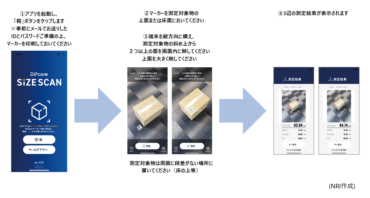 株式会社野村総合研究所(以下「NRI」)とNRIデジタル株式会社は、AIとクラウドテクノロジーを組み合わせたソフトウェア部品群「DiPcore(ディップコア)1」シリーズの計測ソリューションとして、TOFセンサー2を搭載していない端末でも高精度な3辺(縦・横・高さ)計測を可能とする技術3を新たに開発し、計測アプリ「DiPcore SiZESCAN4」に新機能として実装しました。この技術を活用することにより、比較的安価な端末での3辺計測が可能となり、物流業務コストのさらなる削減を実現します。