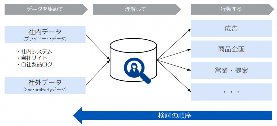 デジタルマーケティングの基本は「データを集めて、理解して、行動する」ことです。情報量が増え続ける現代では多くの企業がお客さまとのタッチポイントでデータを集めて分析し、「個」客に合わせたマーケティングに取り組んでいます。しかし多くの場合、データを集め、理解することに時間を割かれてしまい、肝心な「行動」にたどり着くことが出来ないケースを目にします。デジタルマーケティングに取り組む際には、まず何がしたいのか「行動」から検討を進めていくことをおすすめします。実行したい施策を考え、そこからバックキャストで分析仮説を作り、データを集めていくことがデジタルマーケティングのポイントです。
