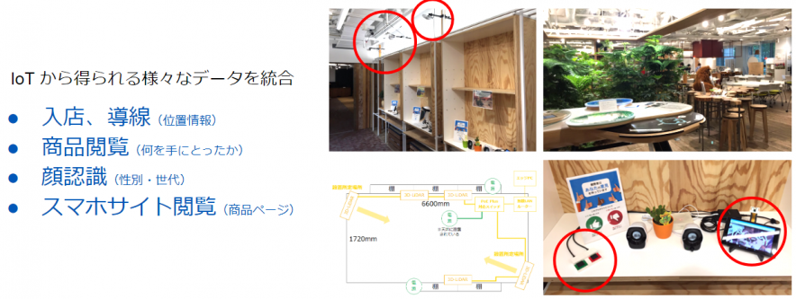 2019年6月に「オンラインとリアルを横断した顧客体験」を実現する実証実験を大手町で行いました。入店・導線の把握、どの商品を手にとったかを把握する IoT センサーを天井に設置し、商品の棚には性別や世代を判定する顔認識 IoT カメラ(AWS の Amazon Rekognition を活用)を置きました。施設の IoT デバイスから得られるリアル接点データを KARTE に流し込み、オンラインとリアルを横断したデータ分析を可能にしました。3週間の実証実験から得られた検証結果を活かし、リアルデジタルマーケティングのソリューションに磨きをかけています。
