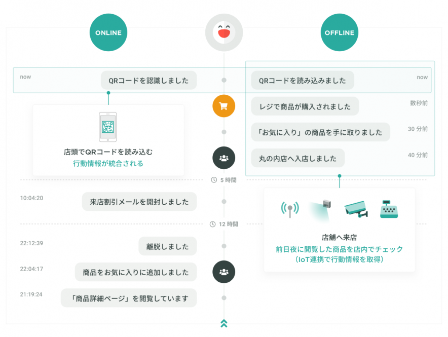 カメラや QR コード、RFID 、センサー等の各種 IoT デバイスから得られる様々なデータを統合し、来訪者の方が店舗でどういった商品を見たか、手に取ったか、またその人がどんな属性の方で商品へどんな感想を持ったかという情報を KARTE に連携、オンラインとオフラインとを横断したデータ連携・分析を行います。