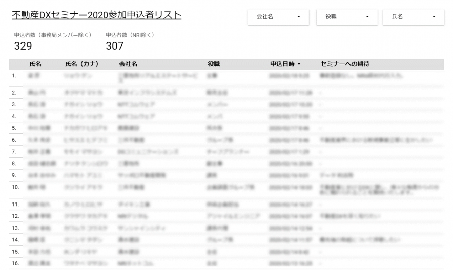 - Google スプレッドシート + Google データポータル:申込者一覧、申込み・来場状況の可視化