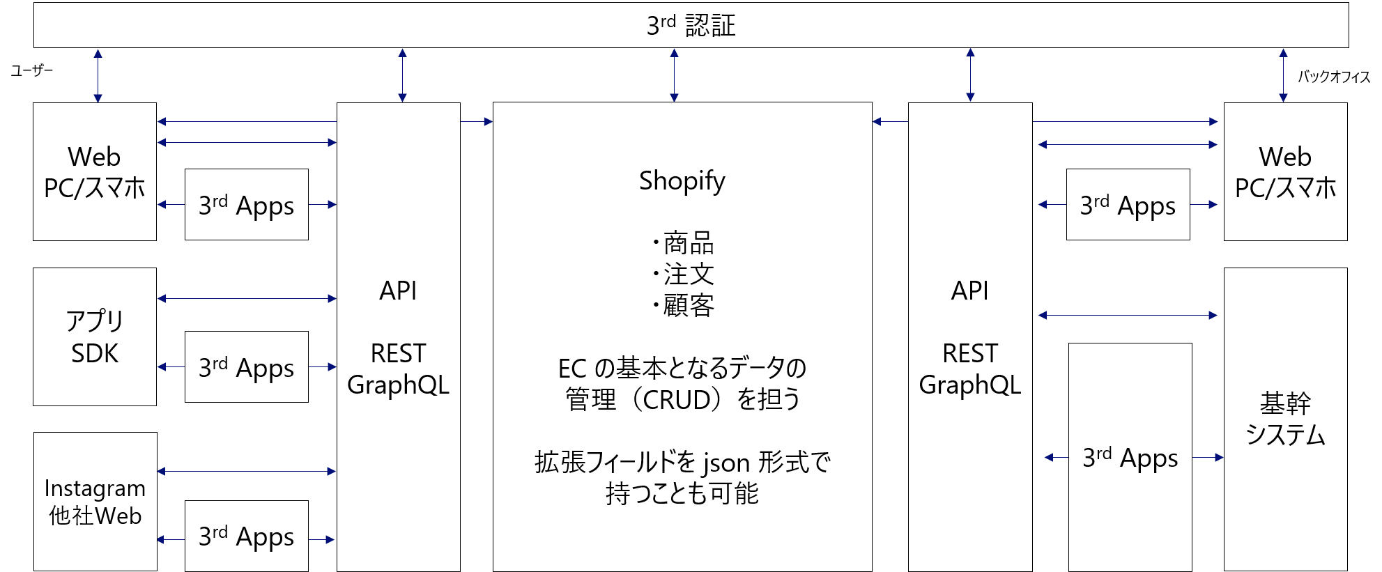 また、Shopify はユーザー向け、バックオフィス向けに API を公開していることが特徴です。API が提供されていることで、マルチチャネルへの展開、フロントエンドとバックエンドの分離(デザイナーとエンジニアの役割分担)、開発の柔軟性を実現していると言えます。
