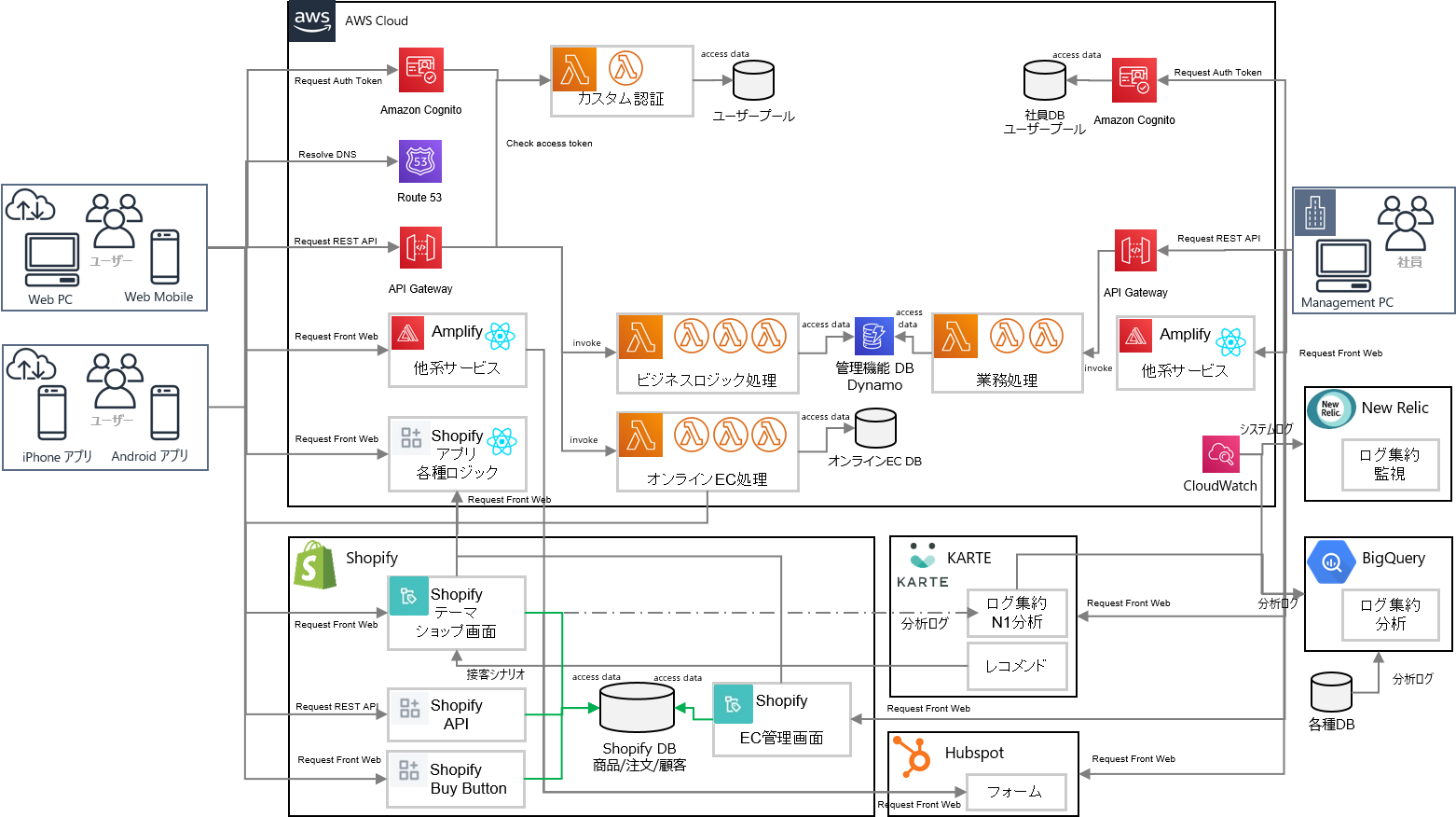デジタルマーケティングを行ったり、Facebook や Google アカウントでのログイン、他システムとの連携を行う場合は以下のような構成を取ります。KARTE / Hubspot 等の外部 SaaS との連携が取りやすいこともマイクロサービスアーキテクチャを採用するメリットです。