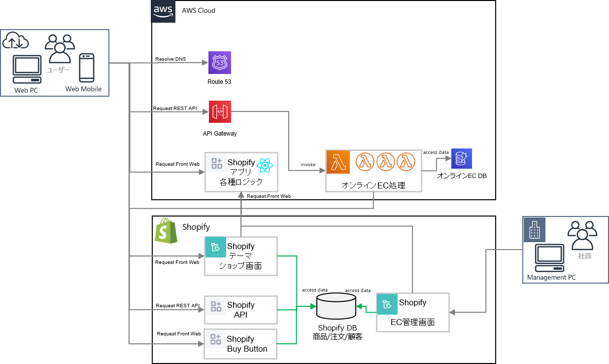 前回の「Shopify でテーマとアプリを開発する – ThemeKit / Shopify App CLI –」では、Shopify が提供する公式ツールを使った開発方法を解説しました。Shopify App CLI はとても便利なツールなのですが、2020年5月時点では本番環境は heroku へのデプロイのみ提供しています。AWS / GCP / Azure などのクラウドで稼動させる場合は別途 CICD パイプラインを構築する必要があります。また Shopify App CLI で生成されるアプリは koa / Node.js をベースとしており Web サーバーを必要とします。本記事では AWS に SPA + Serverless 構成でデプロイする方法を解説します。