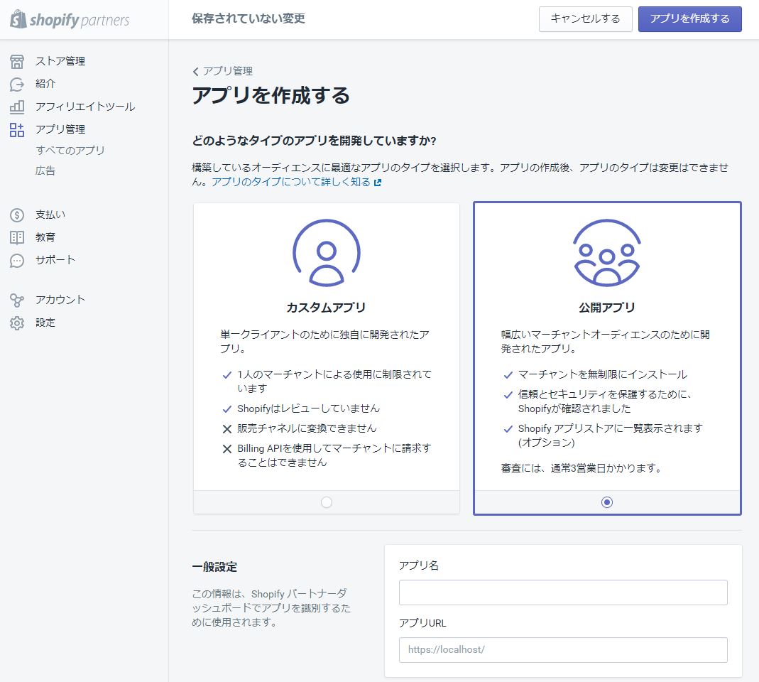 shopify partners アカウントで「アプリ管理」から「アプリを作成する」を押します。次に、公開アプリ・カスタムアプリを選択します。この2つは1つのショップのための拡張開発を行うか、汎用的な拡張機能をアプリとして販売するかの差があります。