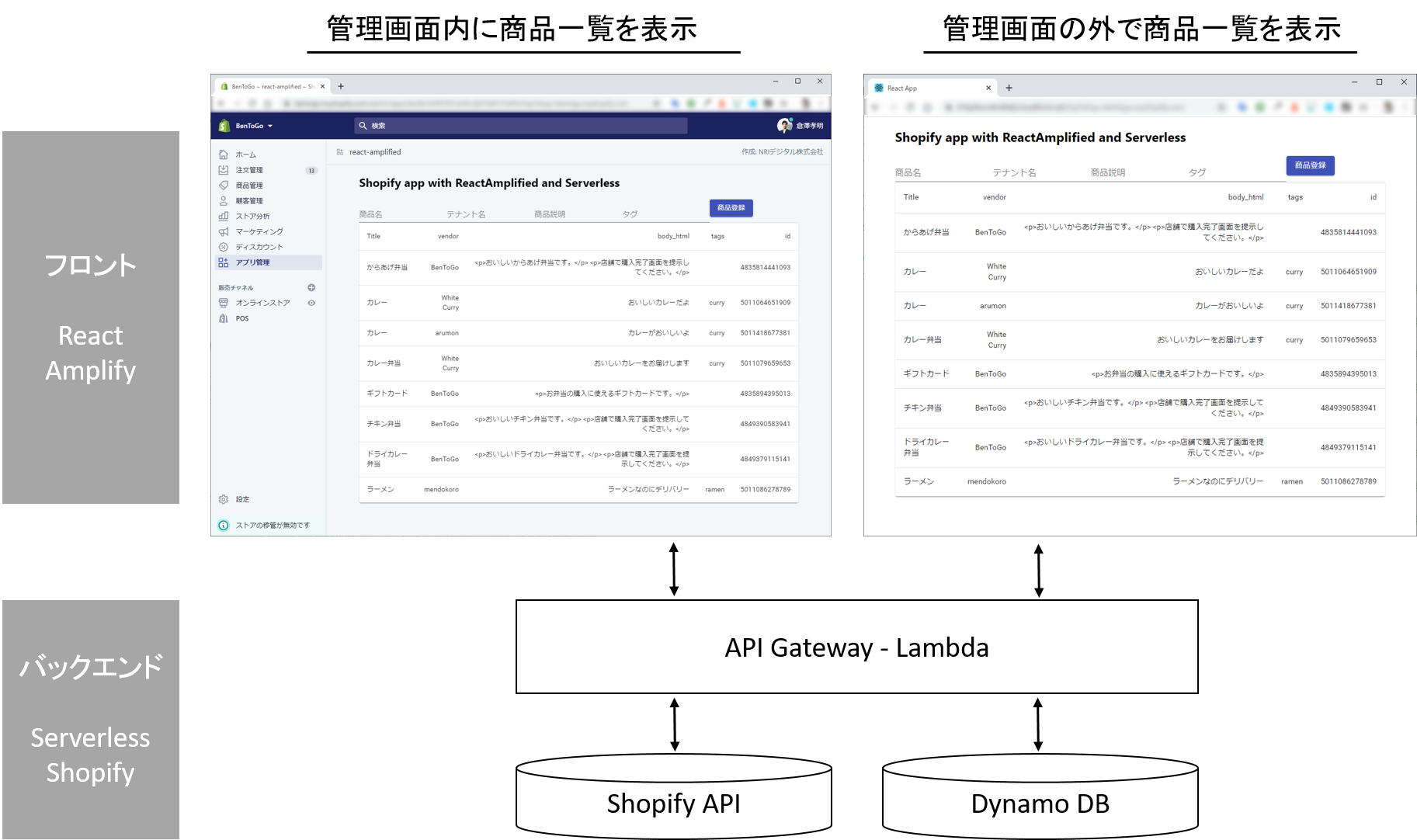 実装は react-amplified/src/Top.js と api-serverless/functions/app.js の /products を参照して下さい。React から直接 Shopify API を呼び出しても構いませんが、本サンプルでは今後の拡張性のために間に Lambda を挟んでいます。