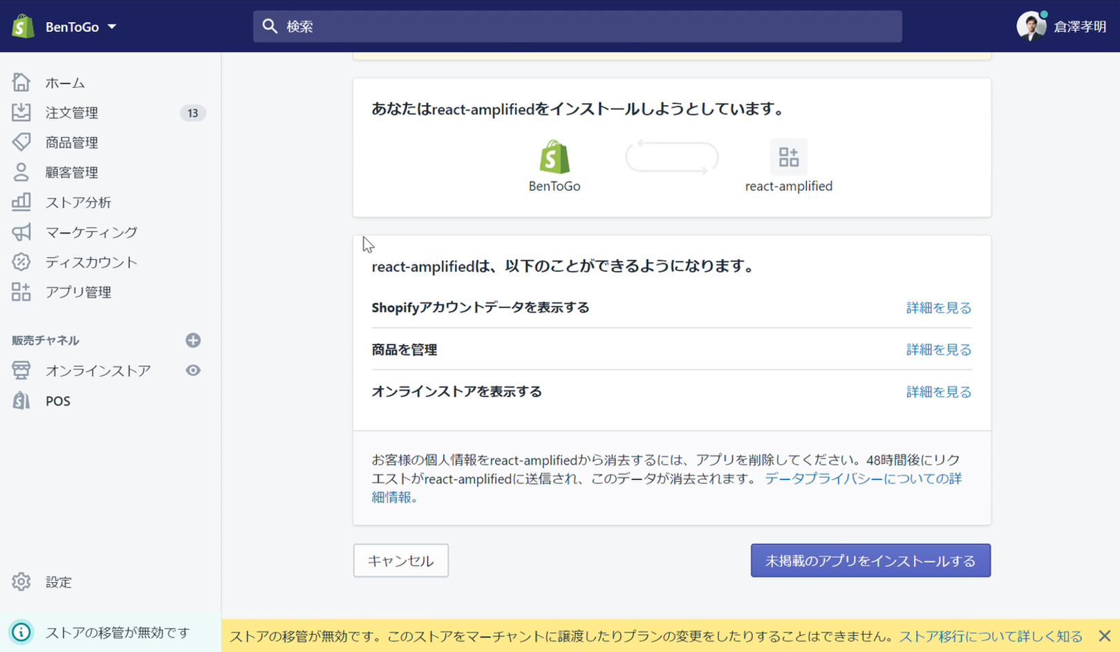 ショップがアプリをインストールするためのリンク(/auth)を押した後に、権限の確認と付与を行う Shopify の画面が表示されます。アプリをインストールすると指定の URL へリダイレクト( /callback )します。
