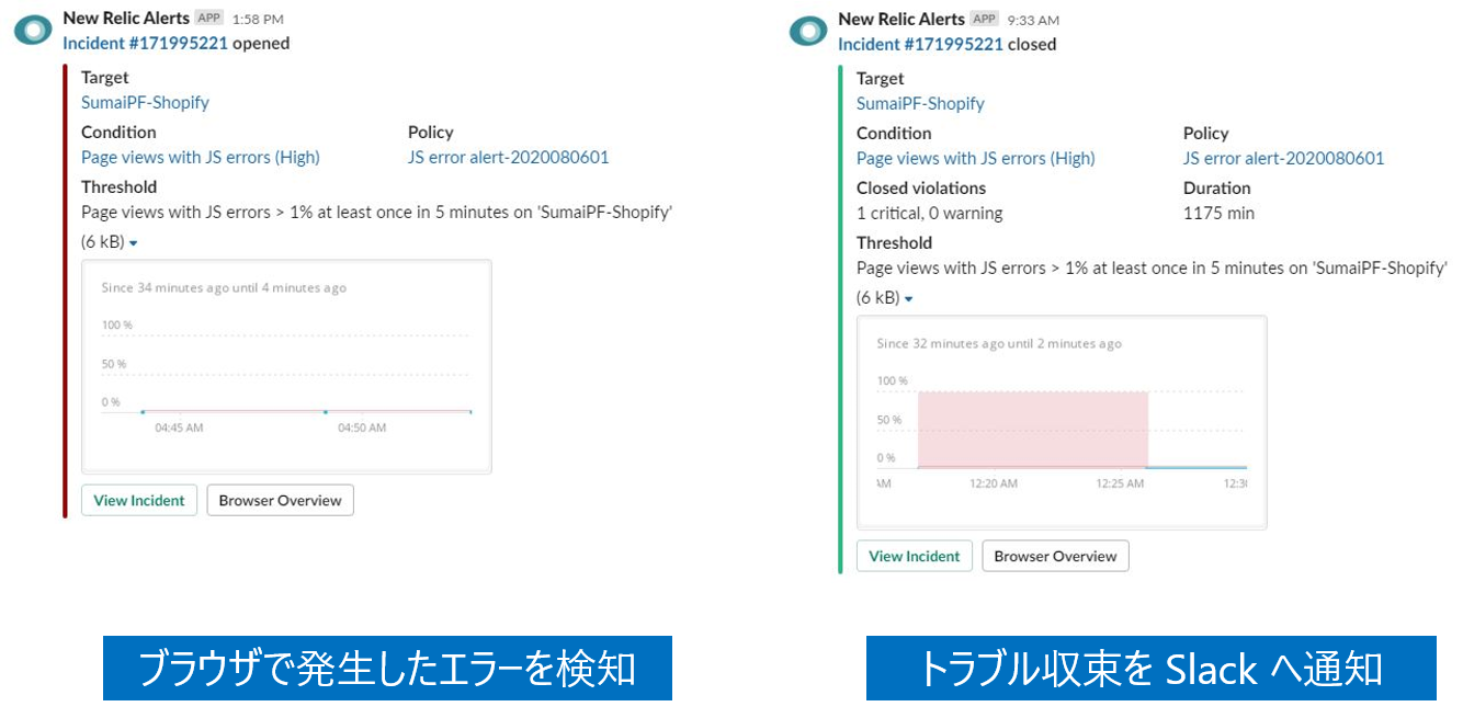New Relic は SaaS 型の可観測性プラットフォームです。アプリケーション、ブラウザ、モバイル、インフラ、全てのパフォーマンスを収集・判定・通知・分析が出来ます。従来のようにサーバーの中に閉じた構成ではなく、マルチクラウド・マルチ SaaS の利用が前提になるシステム開発では、運用監視の考え方を変える必要があります。New Relic はあらゆるデータを1か所に統合・測定し、ソフトウェアスタック全体を分析、トラブルシューティング、最適化することができます。 SaaS を組み合わせてサービス開発をしているため Javascript レイヤーでの監視と SaaS 自体の死活監視を Browser と synthetics を用いて行っています。トラブル発生時は Slack とメールにて通知が発報されるようにしています。本プロジェクトは毎週リリースを行っており、リリース前後でのシステムトラブルが発生していないかは New Relic を用いてチェックしています。