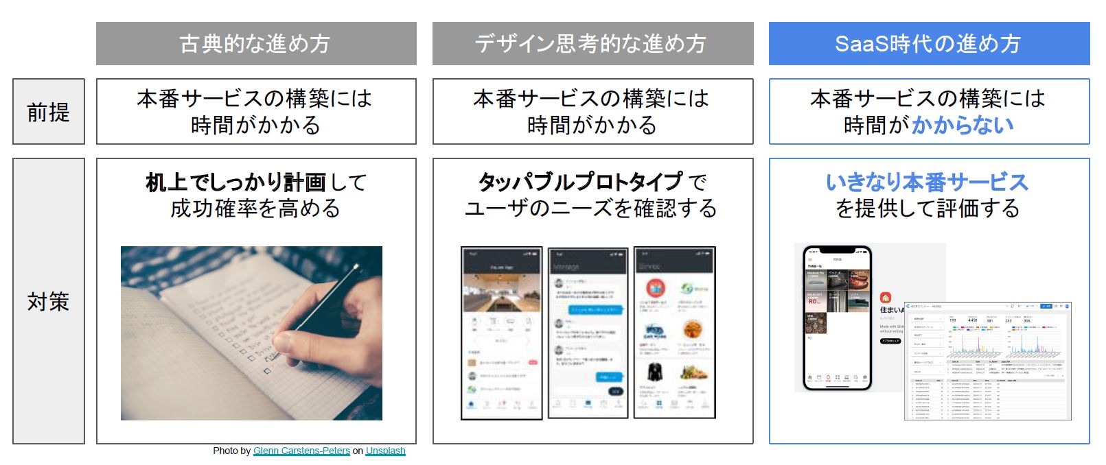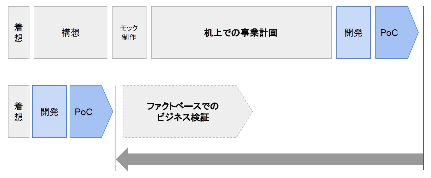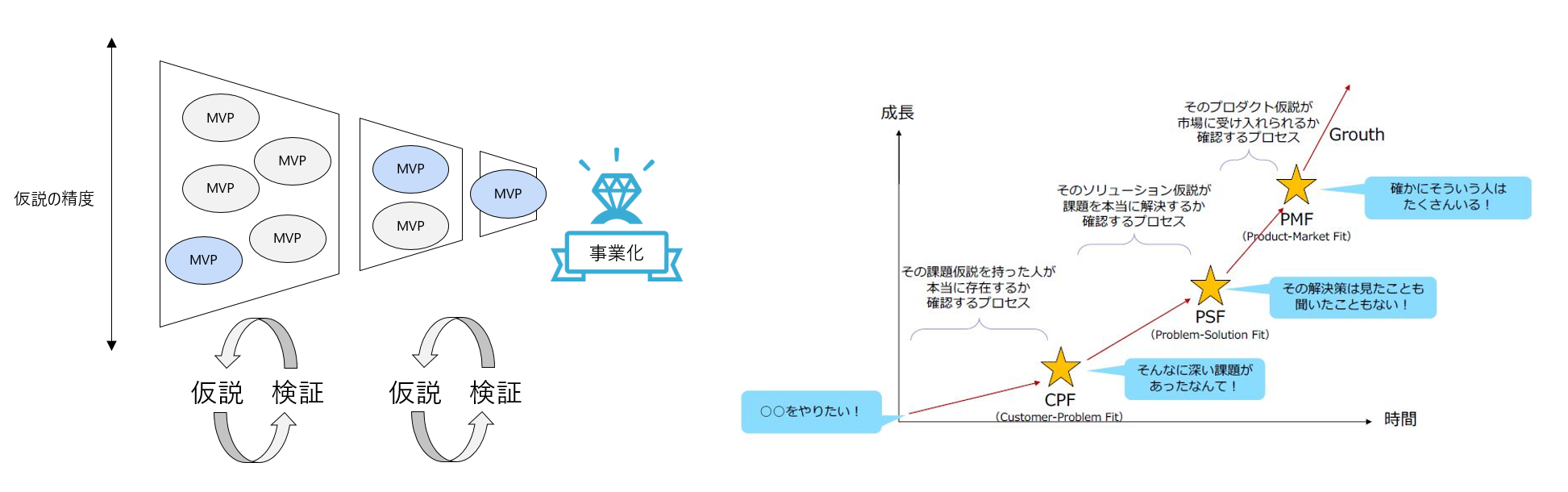 NRI デジタルではお客様との価値共創、新たな事業創出に取り組んでいます。事業開発では Minimum Viable Product(=実用最小限の製品、以降 MVP)を用いてお客様に問うていき、仮説検証を繰り返すことが有効です。事業開発を進める上でのシステム開発チームの役割は、作るものを決めることよりも作らないものを決めることだと考えています。 事業の初期仮説の多くは間違っています。誤っている仮説から正しい仮説へとたどり着くまでは試行錯誤の連続となります。検証して仮説が間違っているとわかるまでの時間をいかに短くするか、正しく検証を行えているかがポイントです。仮説検証はデプスインタビューやタッパブルプロト等で簡易に検証できる場合もあれば、現地に赴いてのサービス提供や実際に決済・購入してもらった後のアンケートでしか評価することができない深い検証のケースもあります。事業開発においてシステム開発を行うチームには、仮説検証の頻度と精度のマネジメントが求められます。