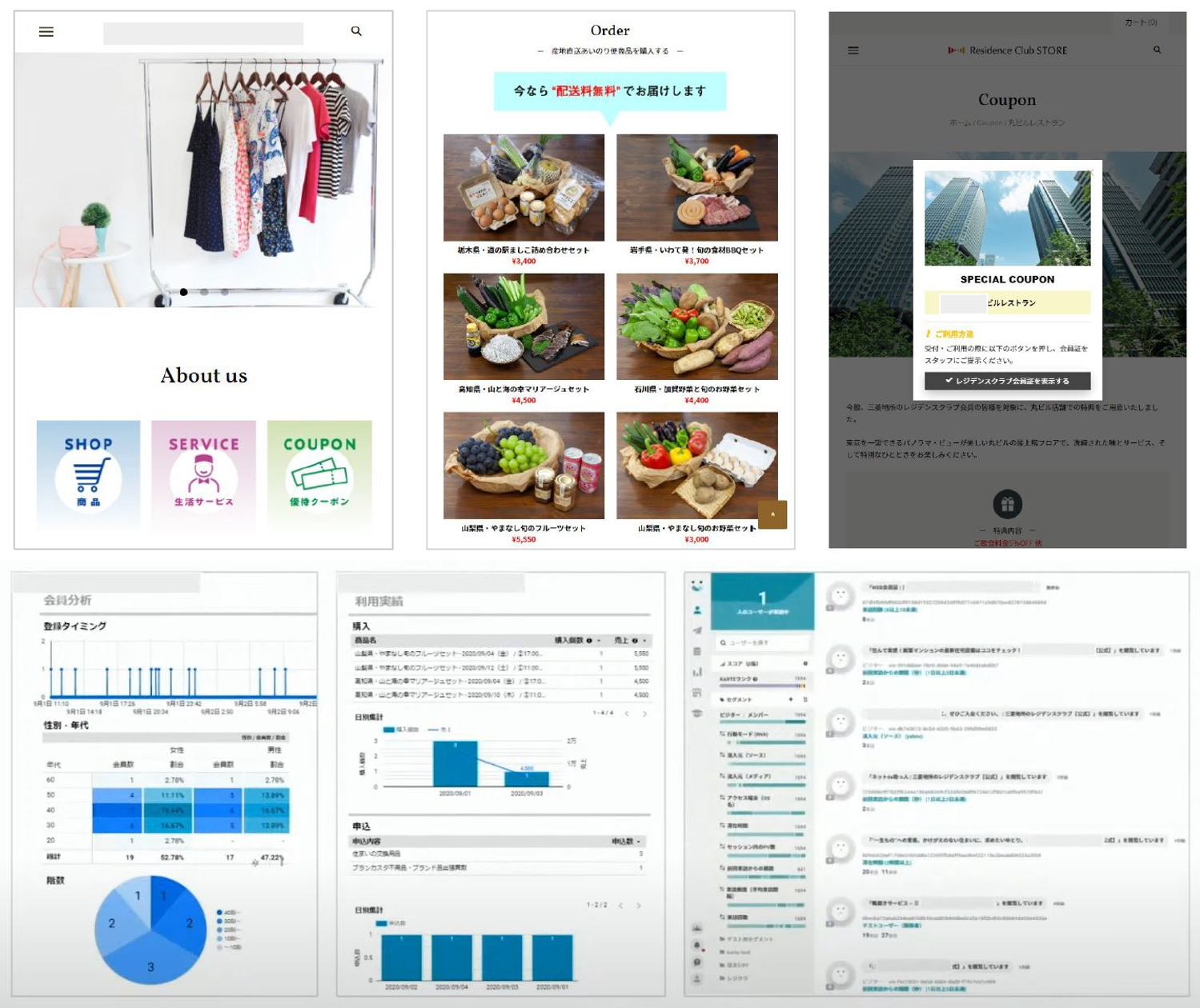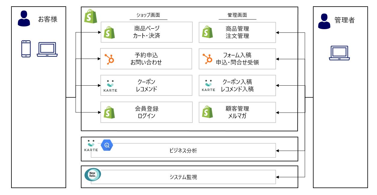 それではここからは事例のご紹介と共に、SaaS の組み合わせパターンをご紹介します。マンション居住者へ生活サービスや物販、クーポンを提供するアプリのβテストを行いました。活用している SaaS は Shopify / KARTE / Hubspot / Data Portal・BigQuery / New Relic です。生活サービス EC ショップ上に、複数の SaaS を部品として組み込んだ構成になっています。各 SaaS の機能は以下のようになっています。- Shopify:EC