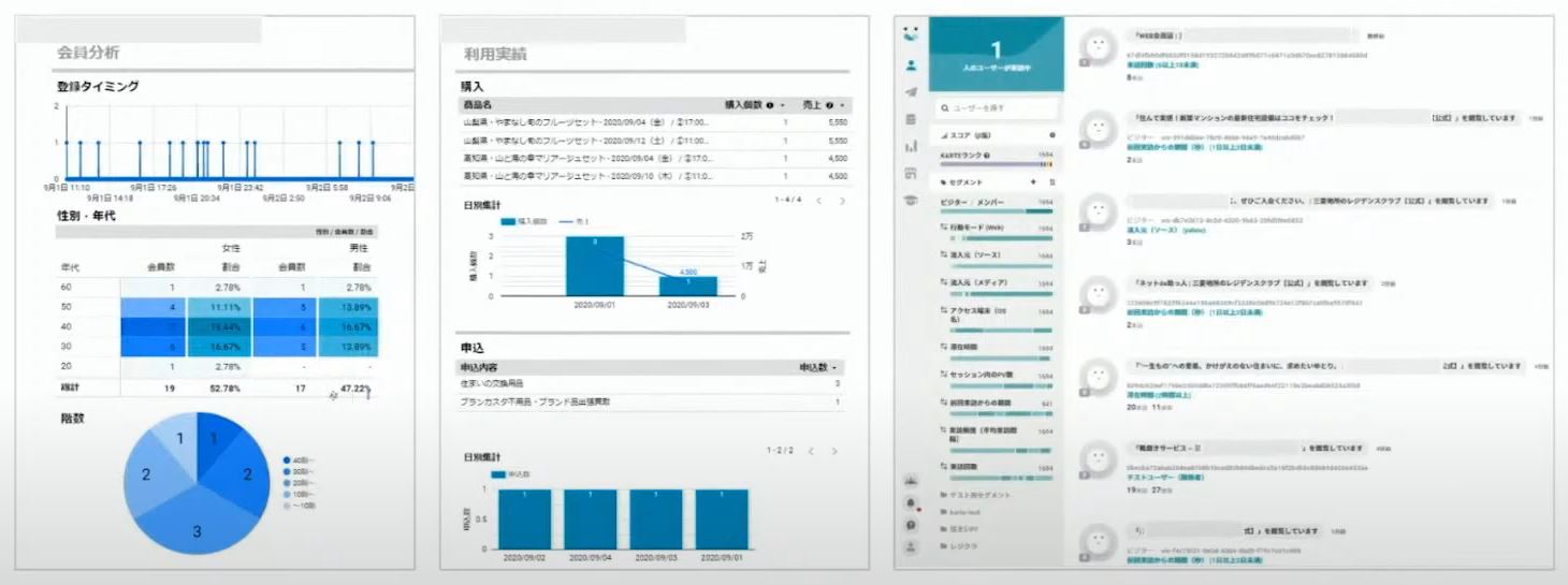 KARTE や Google Analytics で収集したビジネス分析のためのログデータは BigQuery に集約しています。BigQuery はビッグデータを解析できるフルマネージドのサーバーレスデータウェアハウスです。Shopify 上のユーザーの利用状況を分析し Data Portal でビジネス指標を視覚化します。Data Portal はダッシュボード作成、データ視覚化ツールです。Google Analytics や BigQuery とのデータ連携の相性が良いツールです。日次、週次、月次単位でのレポートを自動作成しビジネスの意思決定に活かしています。