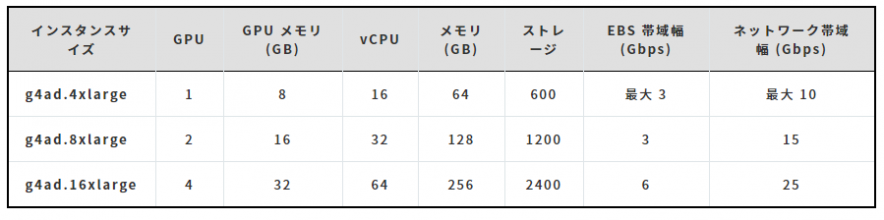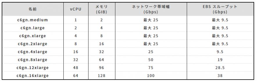 AMD最新のGPUであるRadeon Pro V520 GPUと第2世代EPYCプロセッサを搭載したインスタンスであり、 特に高度なグラフィック作業やゲームストリーミングに強く、それまで用いられていたG4gnインスタンスと 比べグラフィック処理性能は40%近く、コストパフォーマンスは最大で45%改善するとのことです。 一方、小規模の機械学習推論、Nvidia関連の機能を用いるグラフィックアプリに 着手する際は既存のG4gnの方が適しているようです。それ以外のケースではまずはG4adを試すことが推奨 されています。 またDirectX 11/12、Vulkan 1.1、OpenGL 4.5 APIもサポートしています。 インスタンスサイズは以下の3つから選択できます。 ・参考:Coming Soon – Amazon EC2 G4ad Instances Featuring AMD GPUs for Graphics Workloads、Amazon Virtual Workstation (G4ad)C6gn