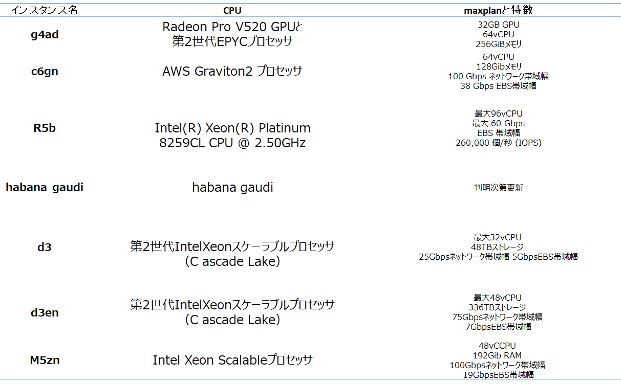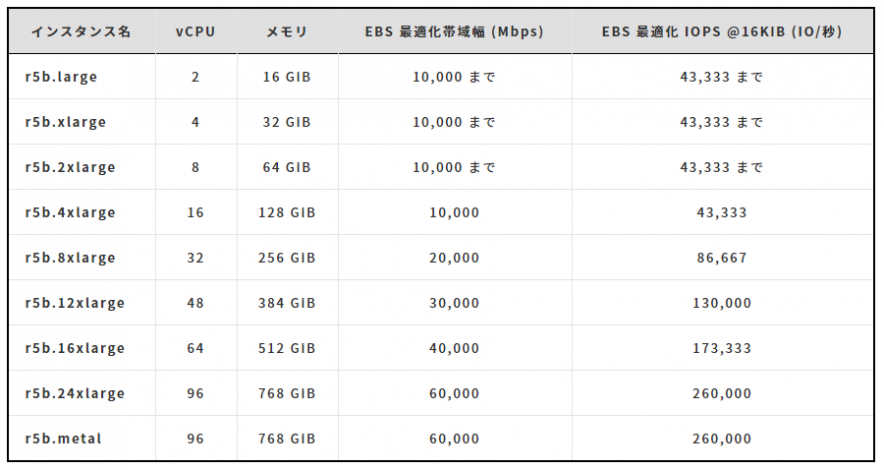 R5bインスタンスはメモリ最適化に特化したR5系インスタンスのうちAmazon Elastic Block Storeで動作します。 分散キャッシングやインメモリデータベースを用いるようなメモリの使用量が多くなるケースに向いており、 特にストレージパフォーマンスを重視する際は他のR5系インスタンスから移行することで最大3倍パフォーマンスが 向上することが見込めます。 インスタンスタイプは8種類です。 ・利用可能リージョン(2020年12月10日現在):米国西部 (オレゴン)、アジアパシフィック (東京)、米国東部 (バージニア北部)、米国東部 (オハイオ)、 アジアパシフィック (シンガポール)、および欧州 (フランクフルト) ・参考:New – Amazon EC2 R5b Instances Provide 3x Higher EBS Performancehabana gaudi