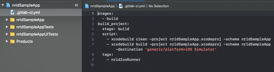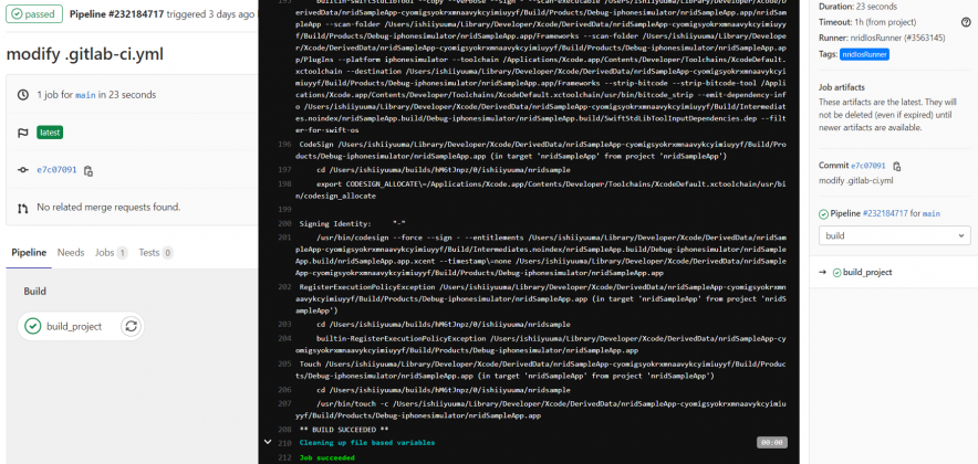 完了したら、iOSプロジェクトをビルドするための.gitlab-ci.ymlを作成し、GitLabのリポジトリにpushします。これで、GitLabにソースコードを変更してpushすると、Macインスタンスにソースコードが読み込まれてビルドされます。
