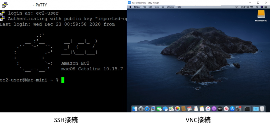Macインスタンス作成後は、EC2作成時に発行された秘密鍵を用いてputty(SSH)で接続し、VNC接続設定を行います。設定が完了したら、VNCでログインできることを確認してください。ここではVNC設定の詳細は省略します。