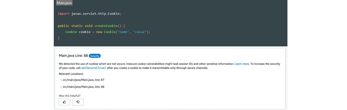 CodeGuru Reviewer Security Detector は、自動化された推論を使用して、すべてのコードパスを分析し、Java コードの奥深くにある潜在的なセキュリティ問題を検出します。これは、複数のメソッドやファイルにまたがっていたり、複数の操作のシーケンスが伴っていたりする場合でも有効です。