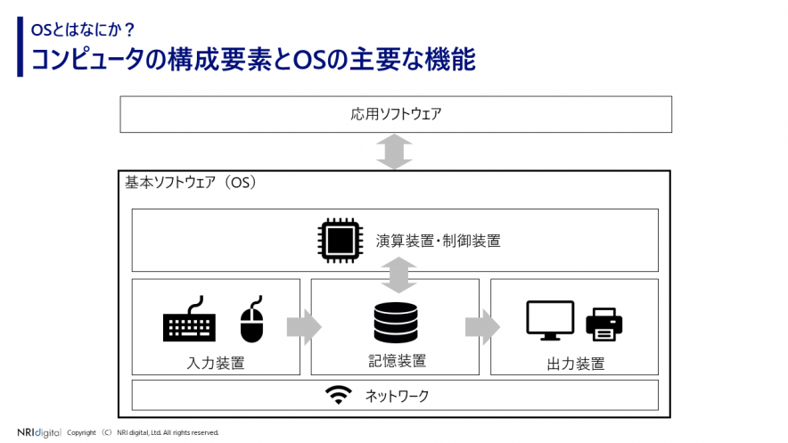OSとはオペレーティングシステムの略で、コンピュータの操作や運用を司るソフトウェアです。ユーザが普段利用するソフトウェアを「応用ソフトウェア」と呼ぶのに対して「基本ソフトウェア」と呼ばれることもあります。身近なPCを例にすると、WindowsがOS(基本ソフトウェア)であり、ExcelやPowerPointが応用ソフトウェアとなります。
