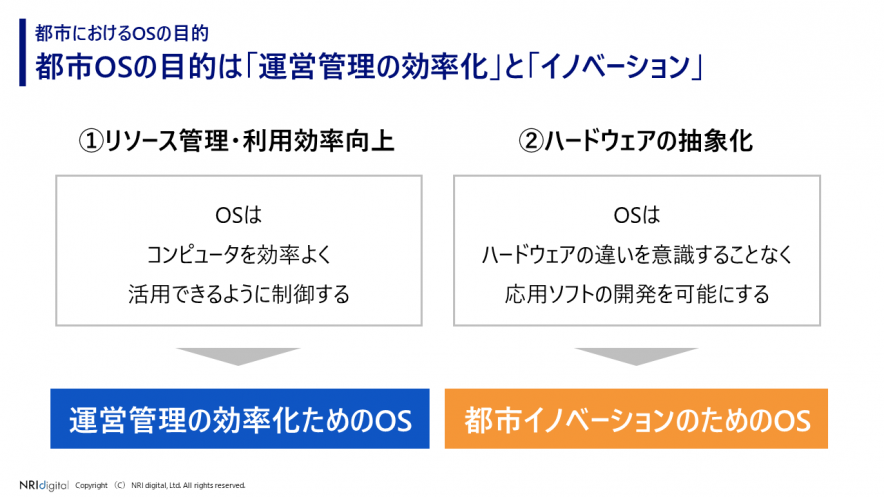 コンピュータのOSの目的は「リソース管理・利用率の向上」と「APIを通じたハードウェアの抽象化」の2つでした。これは都市OSにおいても同様で、「都市のリソース管理・運営管理の効率化」、「都市のAPIを通じた都市のイノベーション」の2つが都市OSの目的といえます。