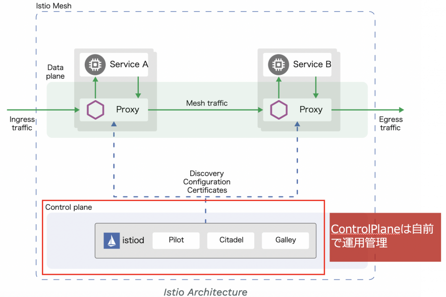 Istioのコントロールプレーンである「Istiod」はPodであり、可用性担保やスケール設計、障害時のトラブルシュートなどは自前で実施しなければなりません。