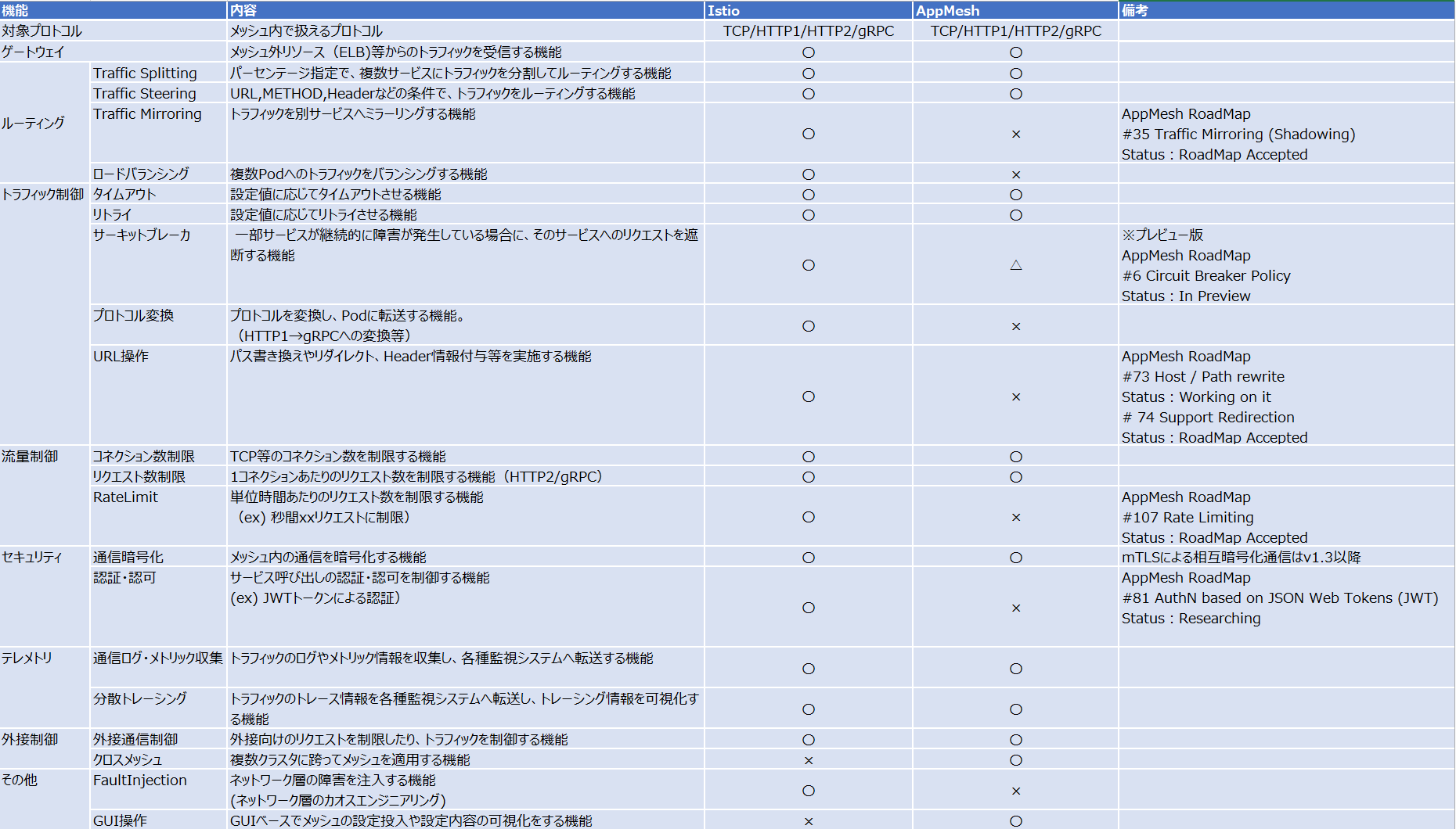 サービスメッシュに必要と思われる機能と、Istio(v1.8)及びApp Mesh(v1.2)における対応状況についてまとめました。