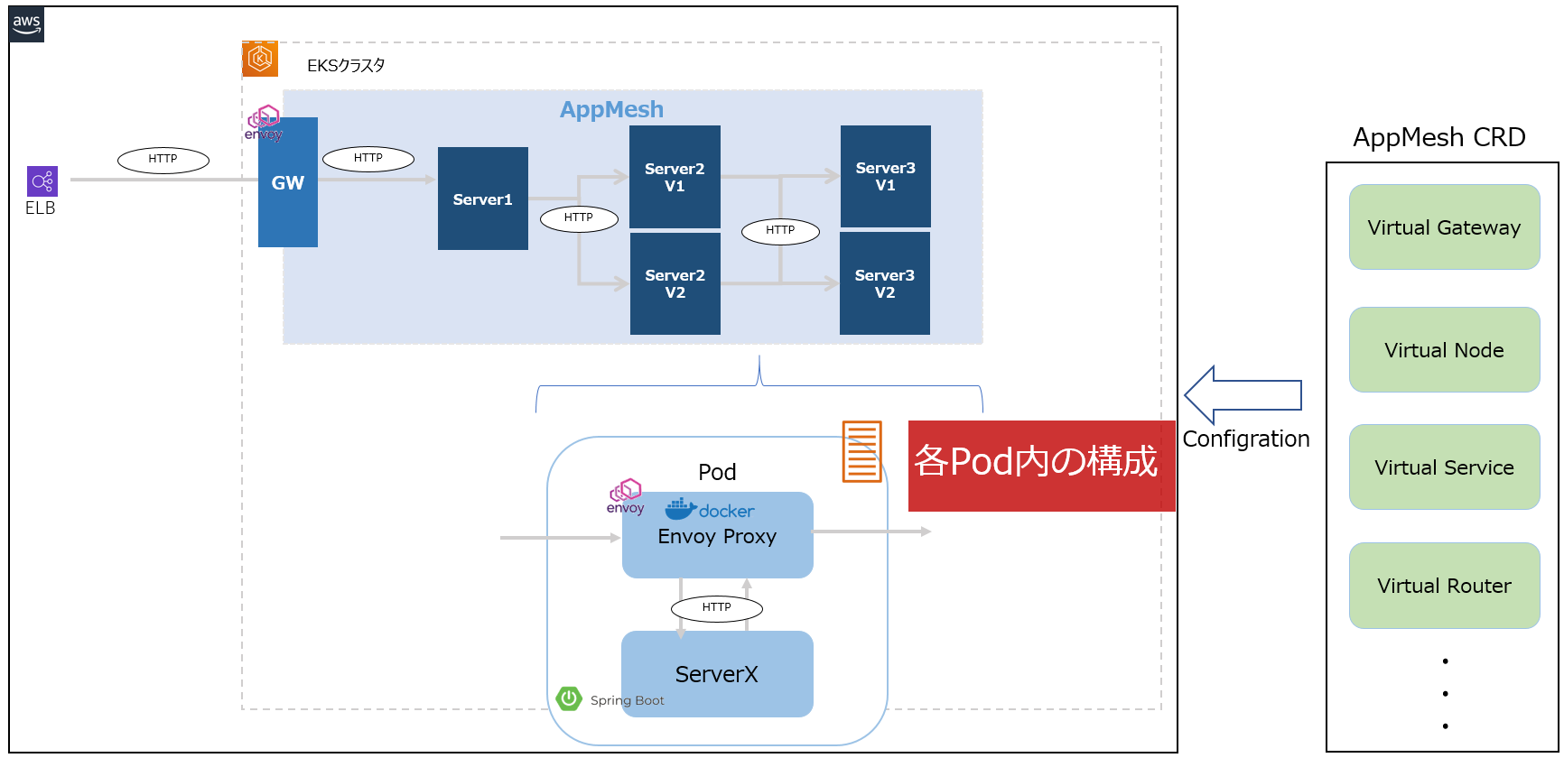 各Pod内は上記の通り、Envoyコンテナがサイドカーとして注入され、CRDの設定に基づきトラフィックの入出力を制御します。