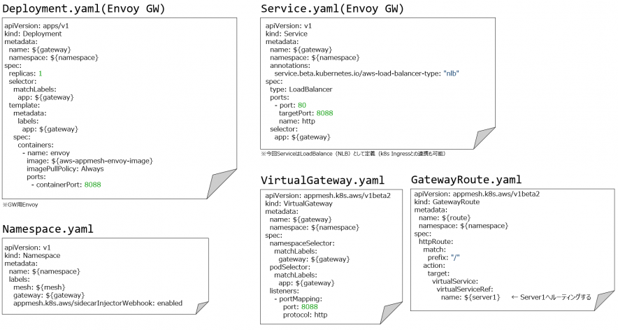 通常、メッシュ外のリソース(ELB等)から直接メッシュ内のリソースへのアクセス出来ない為、メッシュ内外をつなぐGateway機能が必要となります。