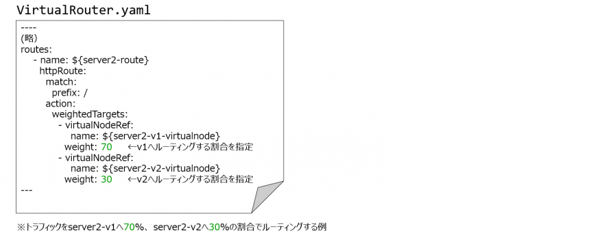 VirtualRouterの設定で、VirtualNodeに振り分ける割合を定義することで実現することができました。