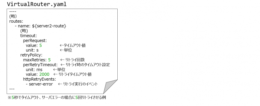 アプリケーションのコードに埋め込むことなく、App Mesh側(Envoy側)でタイムアウト・リトライを制御できます。
