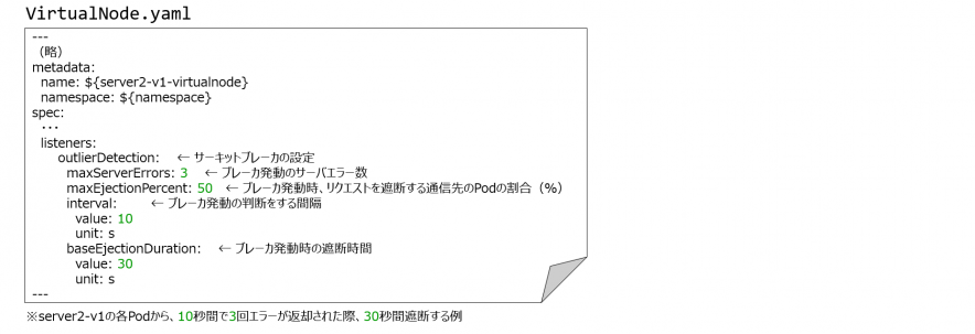 リクエスト先のVirtualNodeのListner定義にサーキットブレークの設定を定義をすることで実現できました。
