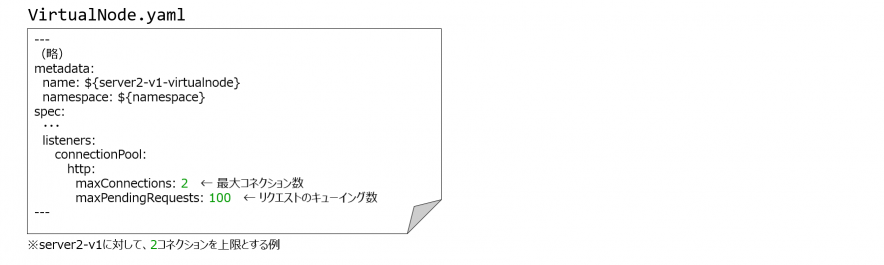 VirtualNodeにコネクションプールの設定を定義することで実現できました。