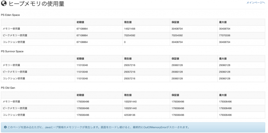 ページをリロードし続けると、ヒープ使用量がどんどん上がっていきやがてOutOfMemoryErrorが発生します。
