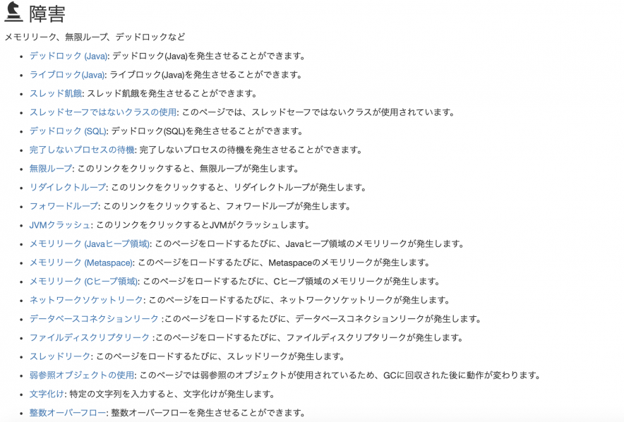 今回利用した「easybuggy」と言うアプリケーションは、様々なバグが仕込んであるWebアプリケーションで、下記のような障害を明示的に発生させられます。