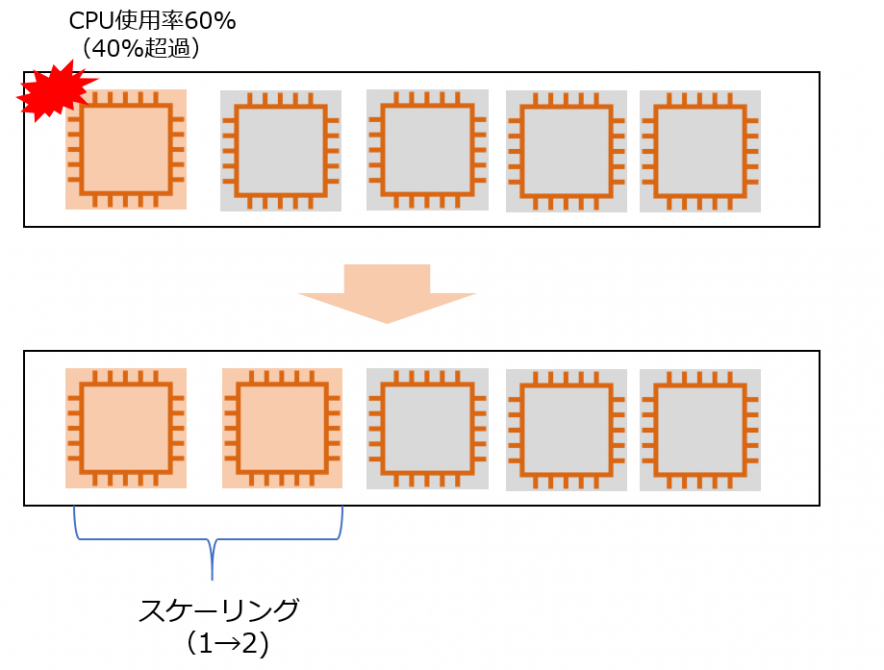 スケーリング条件をCPU使用率「40%」と定義し、稼働中のEC2インスタンスが「60%」のCPU使用率になった場合は、下図の通りインスタンスのCPU使用率が「40%」以内になるよう自動的にEC2インスタンスを増やしてくれます。