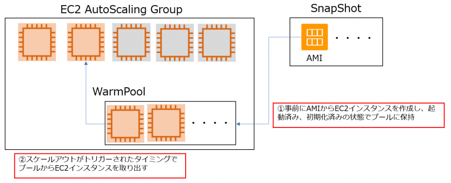 この速度的な課題を解決するのが「Warm Pool」で、事前に起動済み、初期化済みのEC2インスタンスを設定数分Poolに保持しておき、迅速にスケーリングを完了することができます。