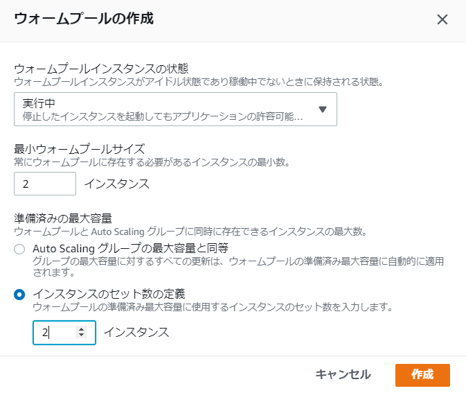 | WarmPool内に保持するインスタンス数 ※WarmPool検証時のみ |