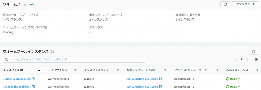 WarmPool内の状況はAWS管理コンソールの画面上で確認できます。