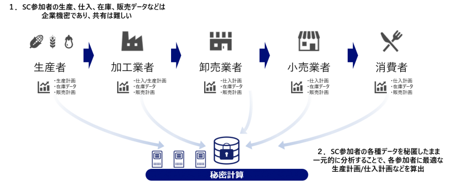 想定されるユースケースとして、サプライチェーン最適化への活用が考えられます。製品のサプライチェーン上には生産者・加工業者・卸売り業者・小売業者・消費者といった複数の企業・ロールが登場します。サプライチェーン全体の最適化を行うためには、各企業の生産・在庫・販売などの各種データを統合し分析する必要がありますが、これらのデータは各企業の企業秘密であり外部への共有が難しいデータでもあります。秘密計算を活用すれば、サプライチェーン参加者の各種データを秘匿したまま一元的に分析することができ、各参加者に最適な生産計画/仕入計画などを算出することができるようになります。サプライチェーン上の企業の機密データを共有せずに共通課題であるサプライチェーンの最適化を実現できる、共通課題解決型がマッチする良いユースケースと言えるでしょう。