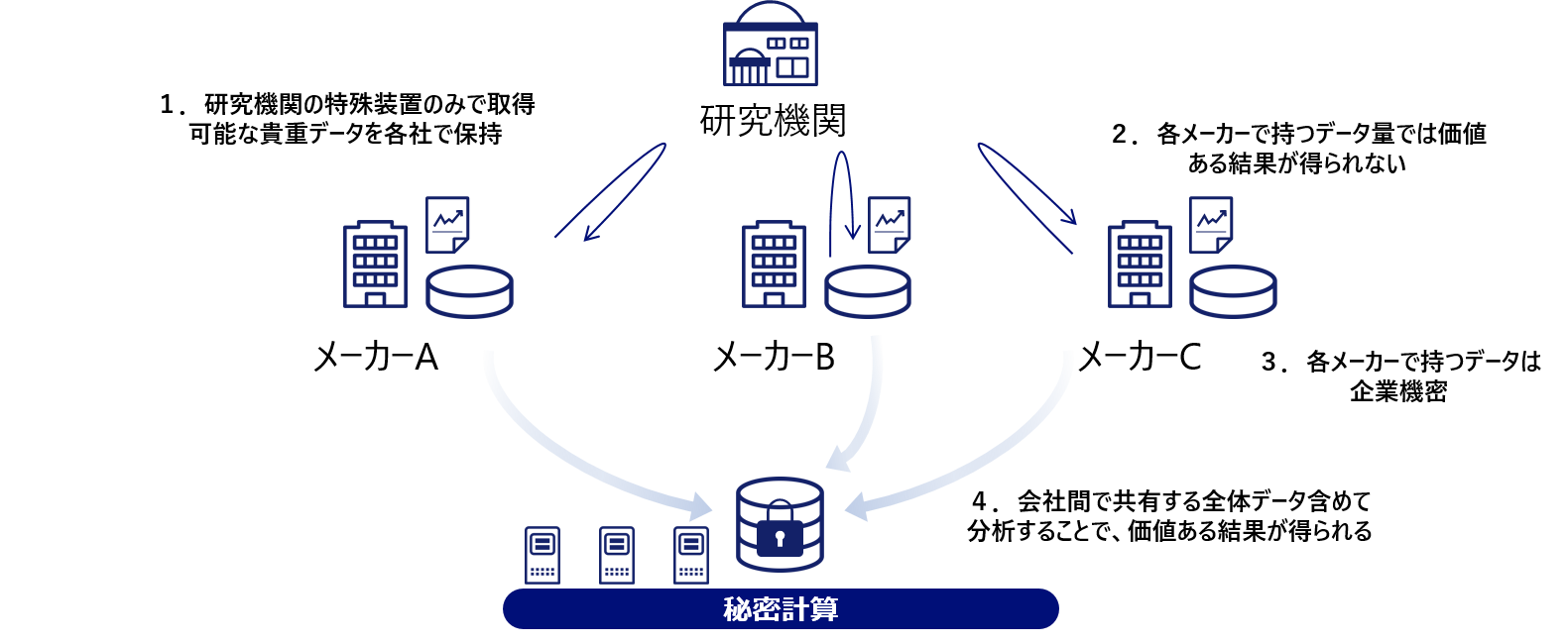 研究開発データを業界内で統合し活用するようなユースーケースも考えられるでしょう。秘密計算を活用すれば、製造メーカーや素材メーカー各社が持つ研究開発データを秘匿して共有し、各社の研究開発に利用することができるようになります。各社が持つ個々のデータでは価値ある結果が得られない場合でも、全体データを含めて分析することで価値ある結果が得られるようになる可能性があります。