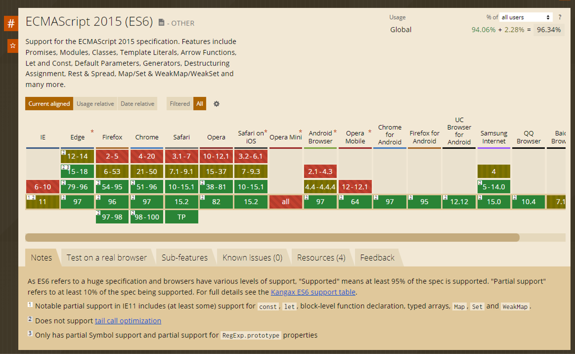 JavaScript の実行環境は「ブラウザ」です。ブラウザごとに言語仕様が異なっていましたが標準化が進み言語としての安定感が増しました。ただし、標準化はされているもののブラウザが最新機能に追いついているかというとそうではありません。Can I use ?というサイトでブラウザの対応状況がわかります。2022年1月現在、ECMAScript 2015 (ES6) をサポートするブラウザは世界で96.34%です。