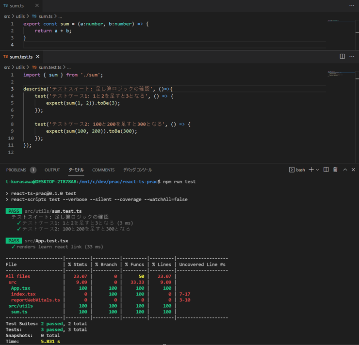 sum という足し算の関数をテストする Jest テストコードサンプル