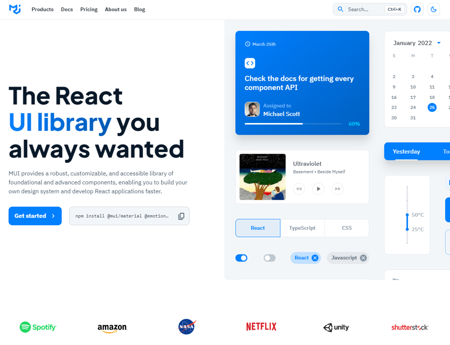 Google が公開している Material UI や Ant Design など一度は目にしたことがあるデザインが React の UI コンポーネントとして公開されています。React を利用することで一定以上の使いやすい UI デザインを最初から獲得することが出来ます。画面を開発する際にはこの UI コンポーネントをパズルのように組み合わせていくだけで良いのです。