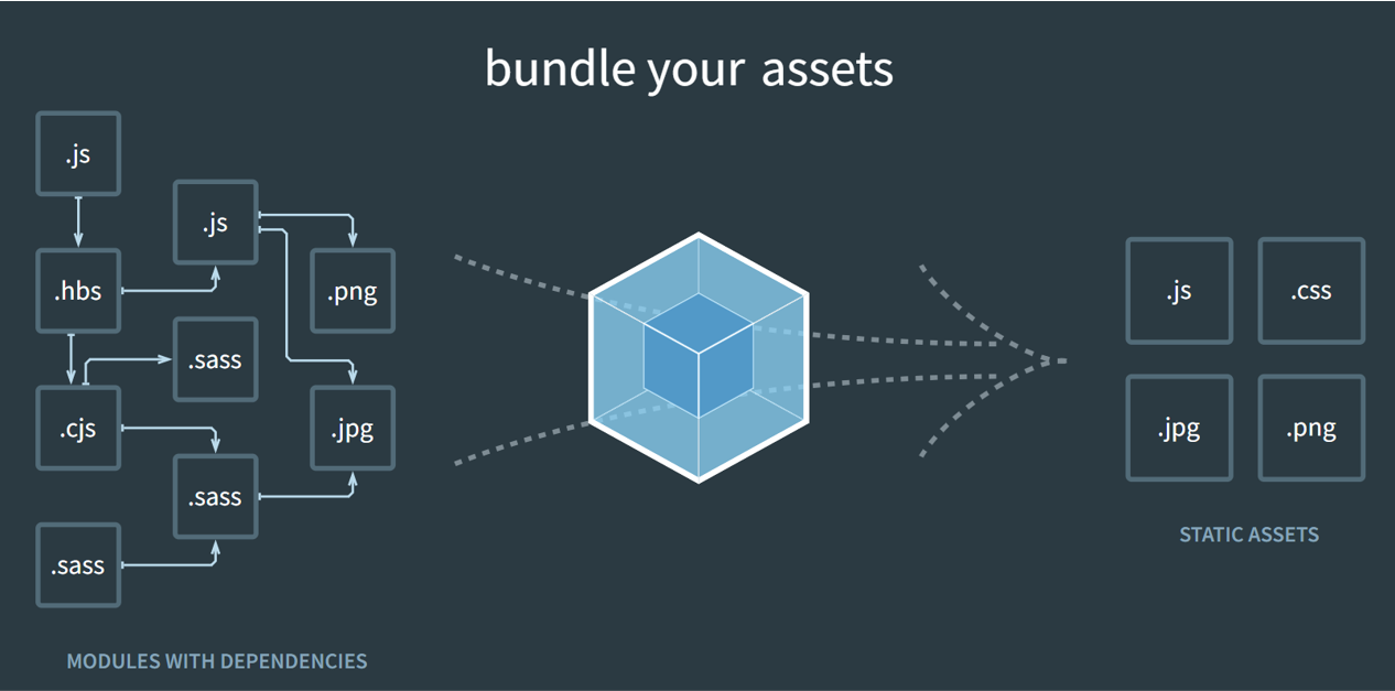 webpack はモジュールバンドラです。複数ファイル間の依存関係を解決して、ブラウザで実行可能な JavaScript ファイルを生成するツールです。まとめる処理をバンドルと呼びます。