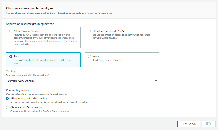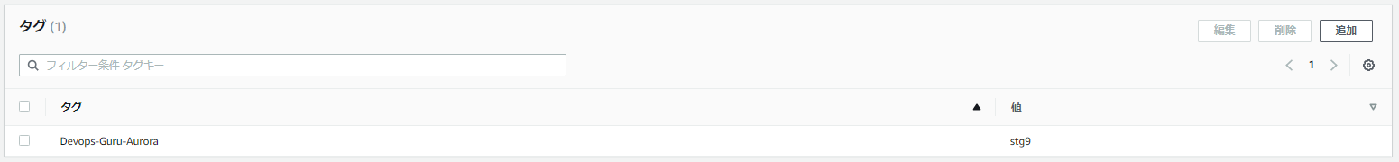 - 調査対象のデータベースクラスタへのタグ(Devops-Guru-Aurora)付与とDevOps Guruへの参照設定