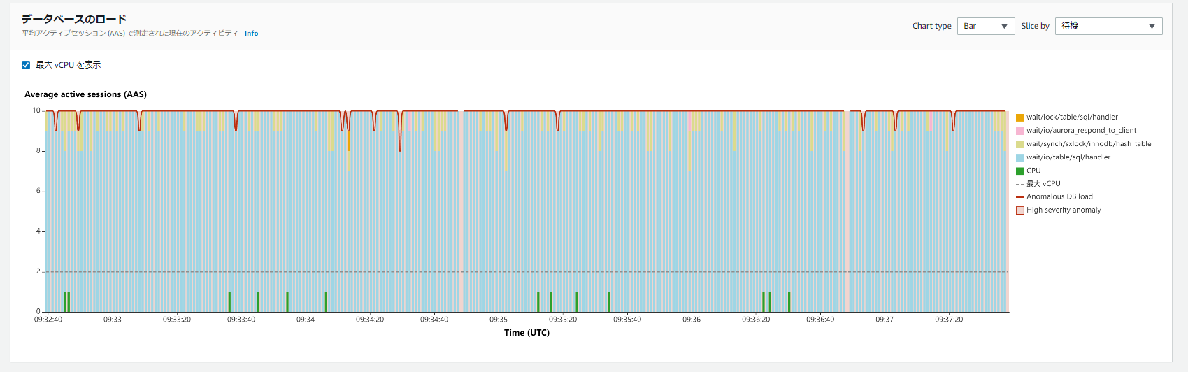 想定通り、Performance Insights上では待機イベントが溜まり続け異常な状態になりました。