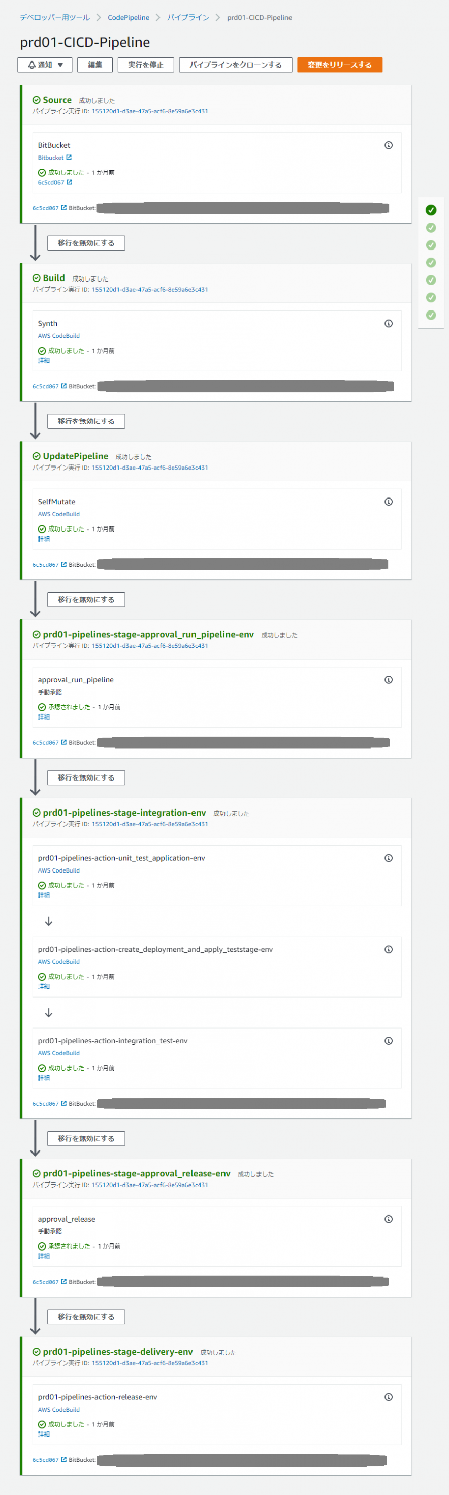- 一部、Blue/Greenデプロイ方式を取ることで、環境上でのリリース前のテスト(連結テスト)を可能にしています(prd01-pipelines-stage-integration-env 部分)。ここは、開発環境などの別環境でリリース後にテストをすればよい、などいくつかの考え方がありますが、ここでは環境差異リスクも考えて、最低限のデプロイ後テストを含めてパイプライン内でのCIとして実行できる構成を取ります。