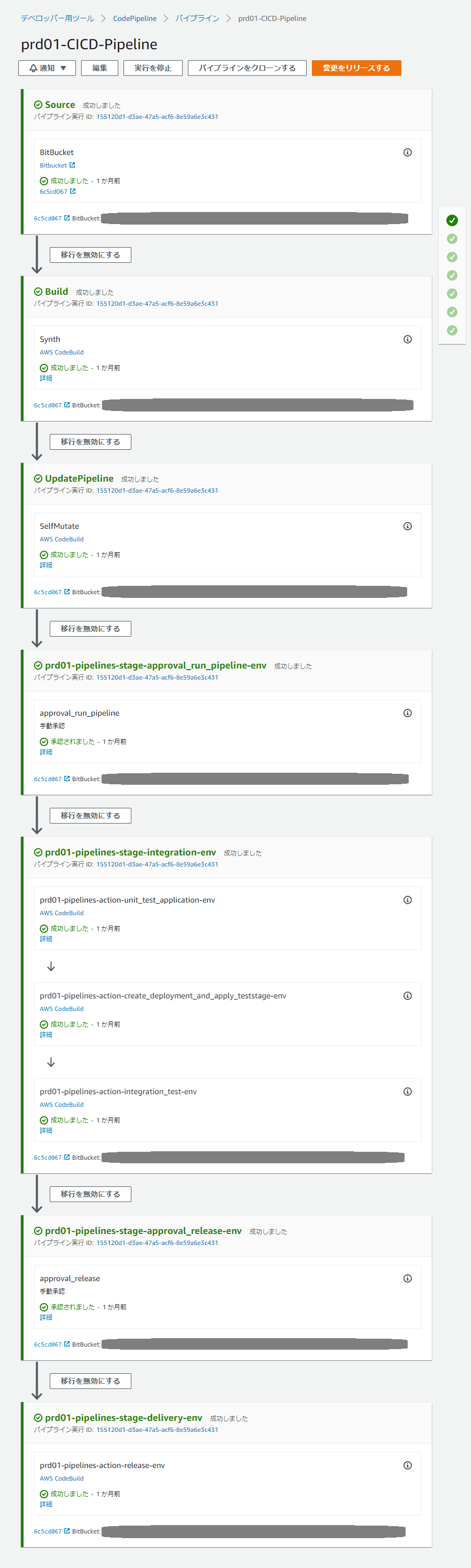 - 一部、Blue/Greenデプロイ方式を取ることで、環境上でのリリース前のテスト(連結テスト)を可能にしています(prd01-pipelines-stage-integration-env 部分)。ここは、開発環境などの別環境でリリース後にテストをすればよい、などいくつかの考え方がありますが、ここでは環境差異リスクも考えて、最低限のデプロイ後テストを含めてパイプライン内でのCIとして実行できる構成を取ります。