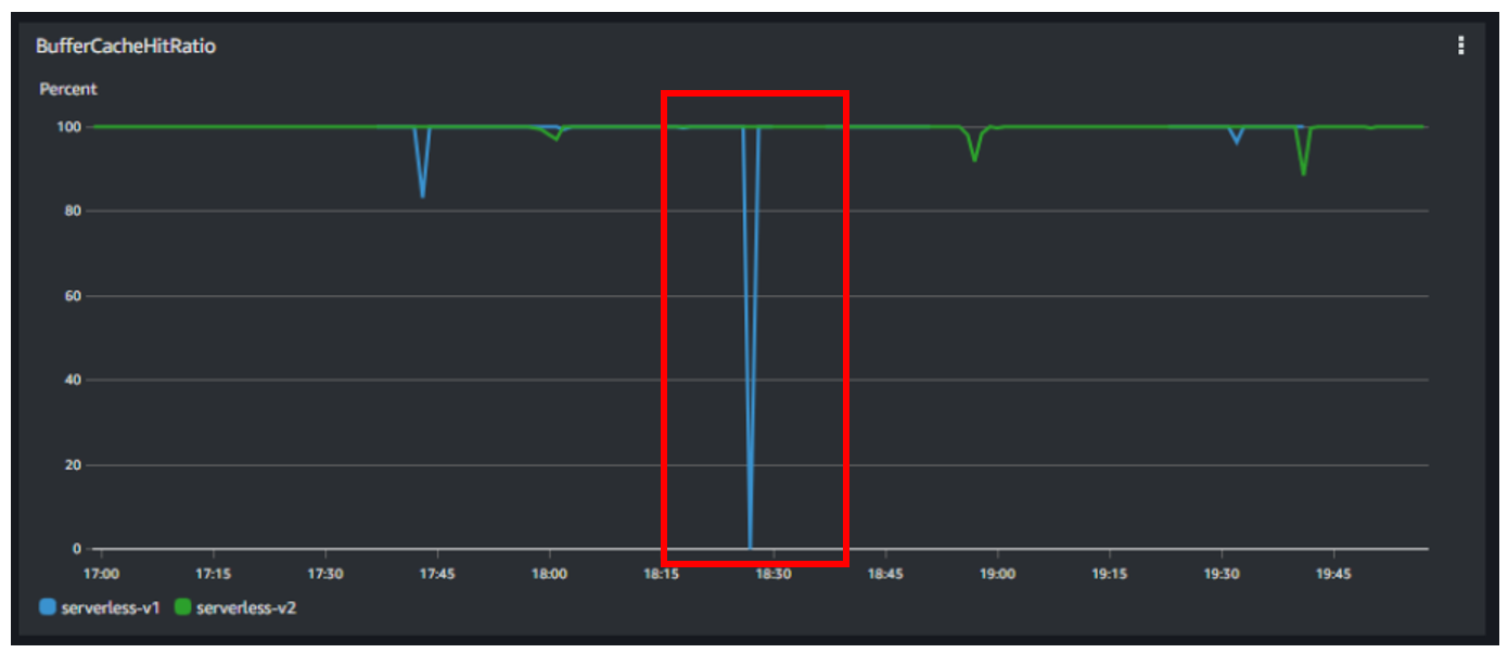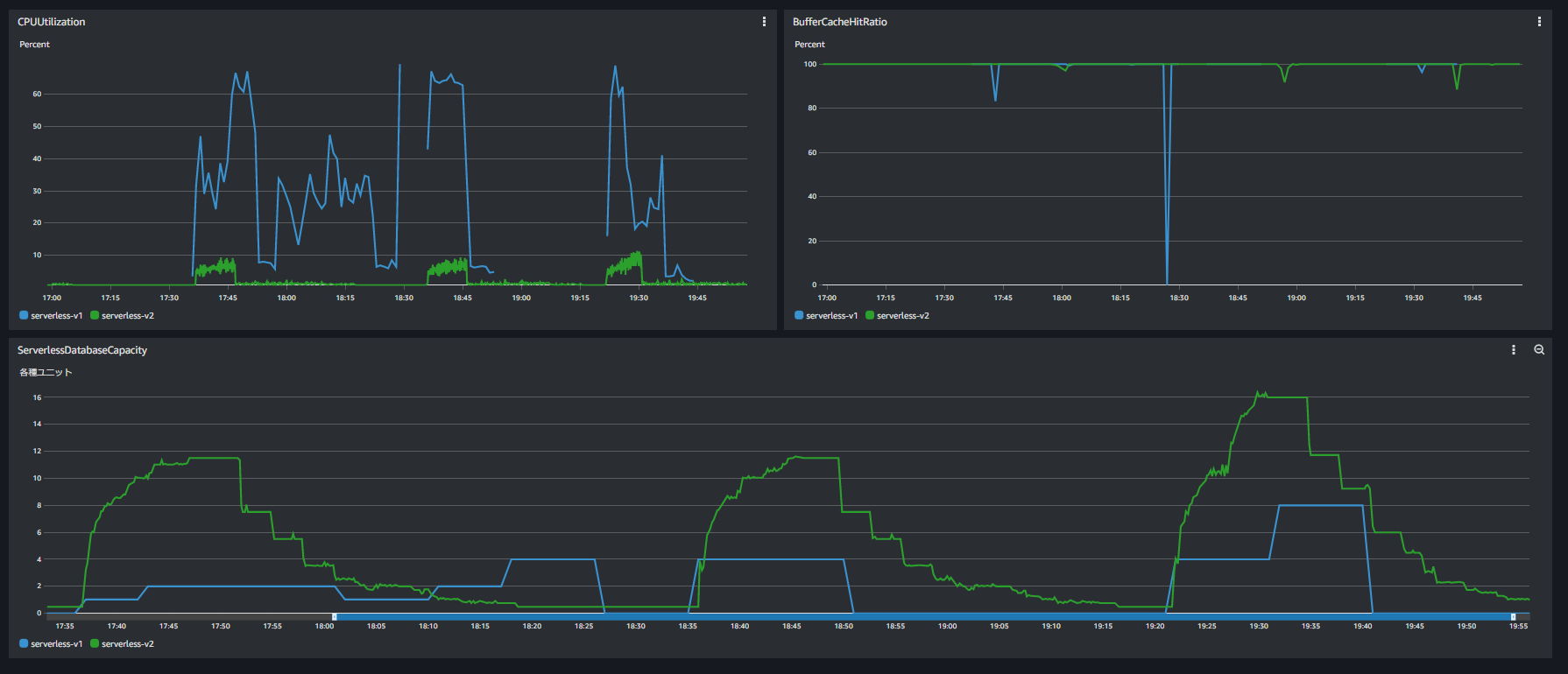※折れ線の青が「Serverless V1」、緑が「Serverless V2」となります。
